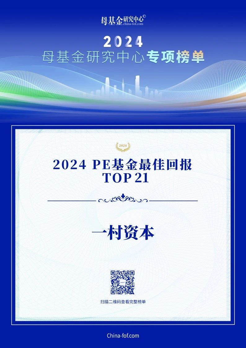在此背景下,母基金研究中心(www.china-fof.com,下同)根据已有的数据支撑与研究分析,正式发布了2024年度专项榜单。一村资本凭借前瞻性的布局和市场的认可,荣膺“2024 PE基金最佳回报TOP 30”(第21名)。