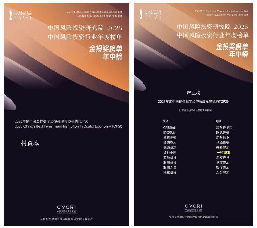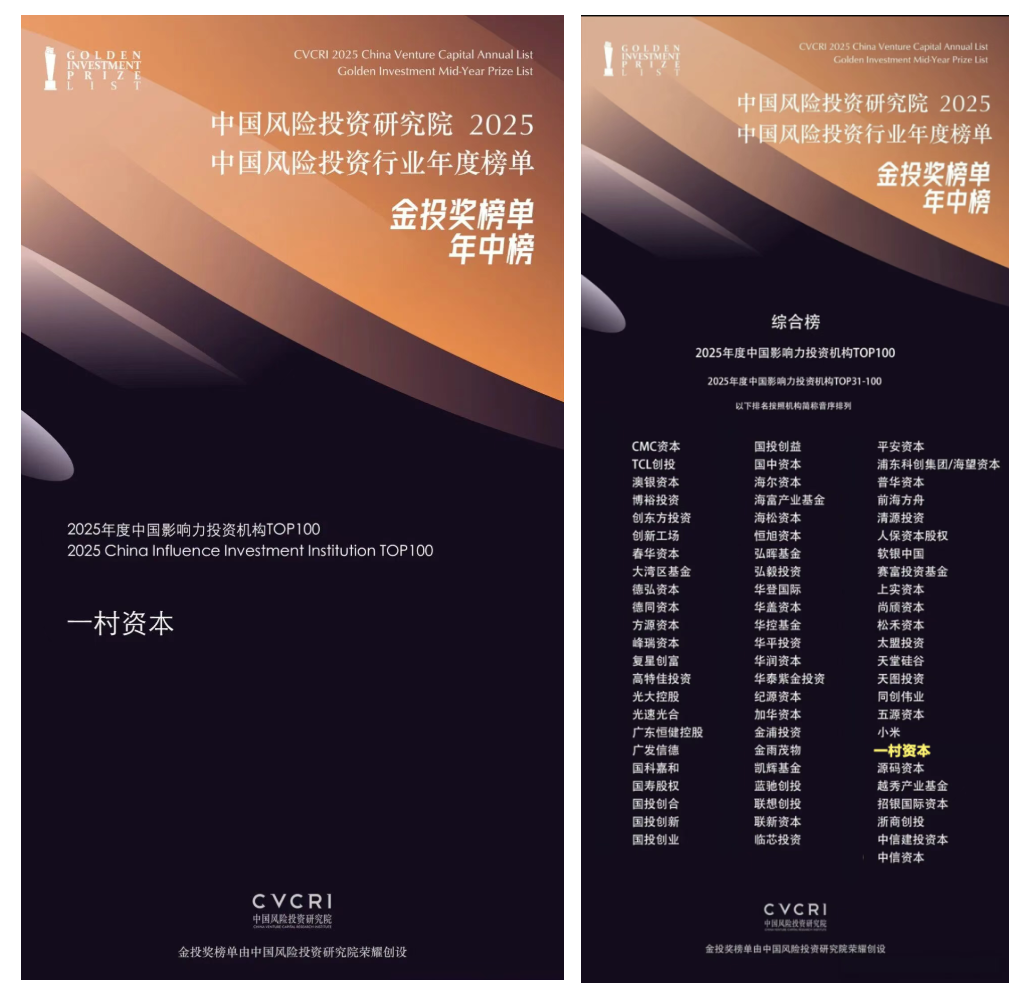 近日,中国风险投资研究院隆重揭晓“2025中国风险投资行业年度榜单·金投奖榜单·年中榜”。一村资本凭借卓越的投资实力与行业影响力,荣膺“2025年度中国影响力投资机构TOP100”和“2025年度中国最佳数字经济领域投资机构TOP20”两项荣誉。
