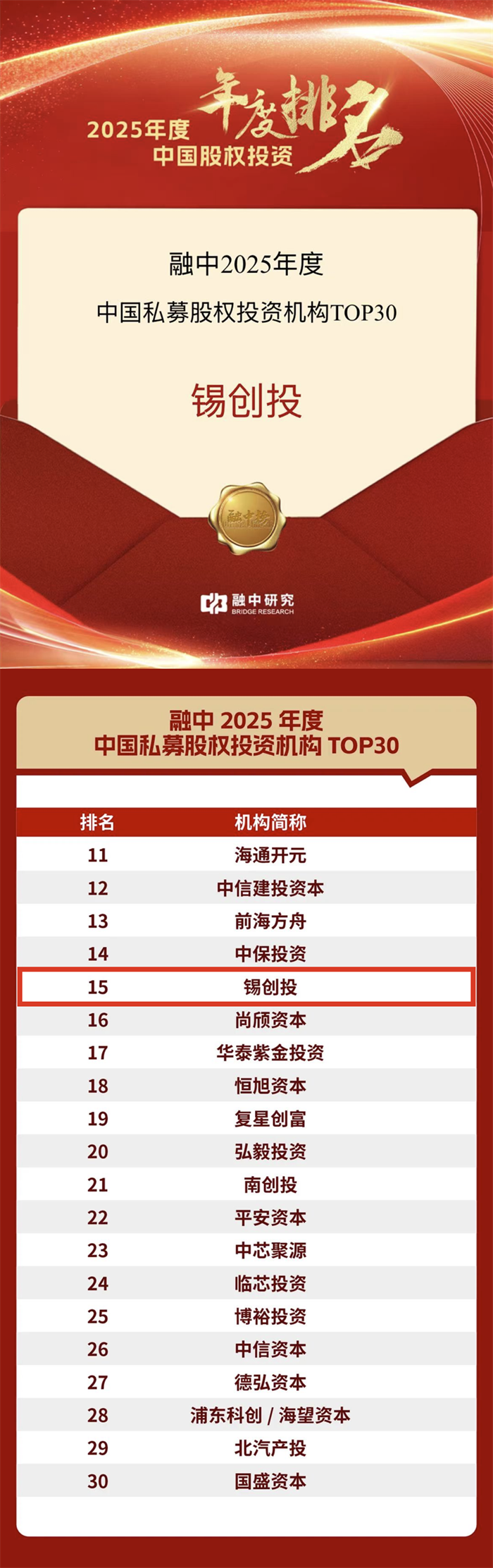 ▼ 2025年度中国私募股权投资机构TOP30(第15位)