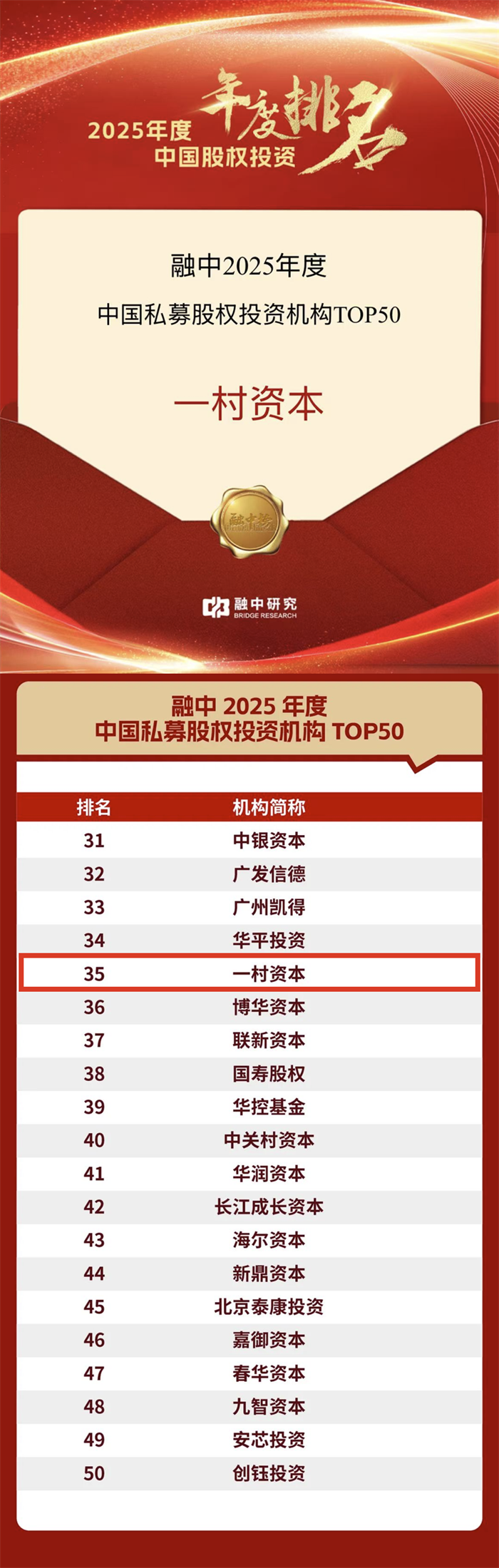 ▼ 2025年度中国私募股权投资机构TOP50(第35位)