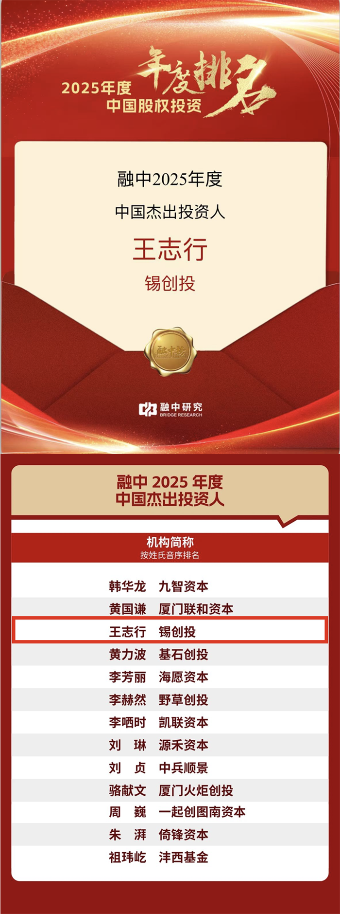 ▼ 锡创投总裁、一村资本董事长王志行——2025年度中国杰出投资人