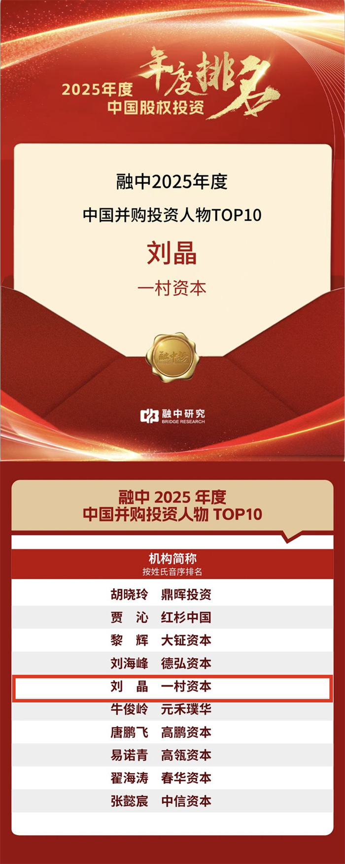 ▼ 一村资本管理合伙人刘晶——2025年度中国并购投资人物TOP10